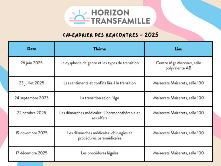 Horizon TransFamille est un groupe de soutien et d’éducation ouvert pour les parents et proches de personnes trans et non-binaires. Il a pour but d’accompagner les parents et proches afin de développer une meilleure compréhension de cette réalité dans l’optique de bien soutenir et accompagner leur enfant ou proche, ainsi que de leur donner un espace pour discuter avec des personnes vivant des enjeux similaires.